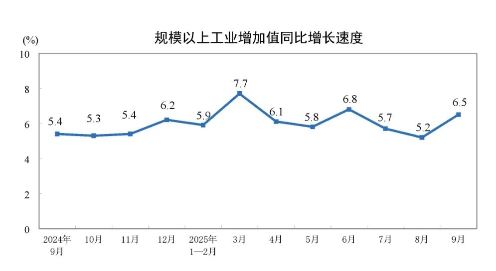 分三大门类看,9月份,采矿业增加值同比增长6.4%,制造业增长7.3%,电力、热力、燃气及水生产和供应业增长0.6%。