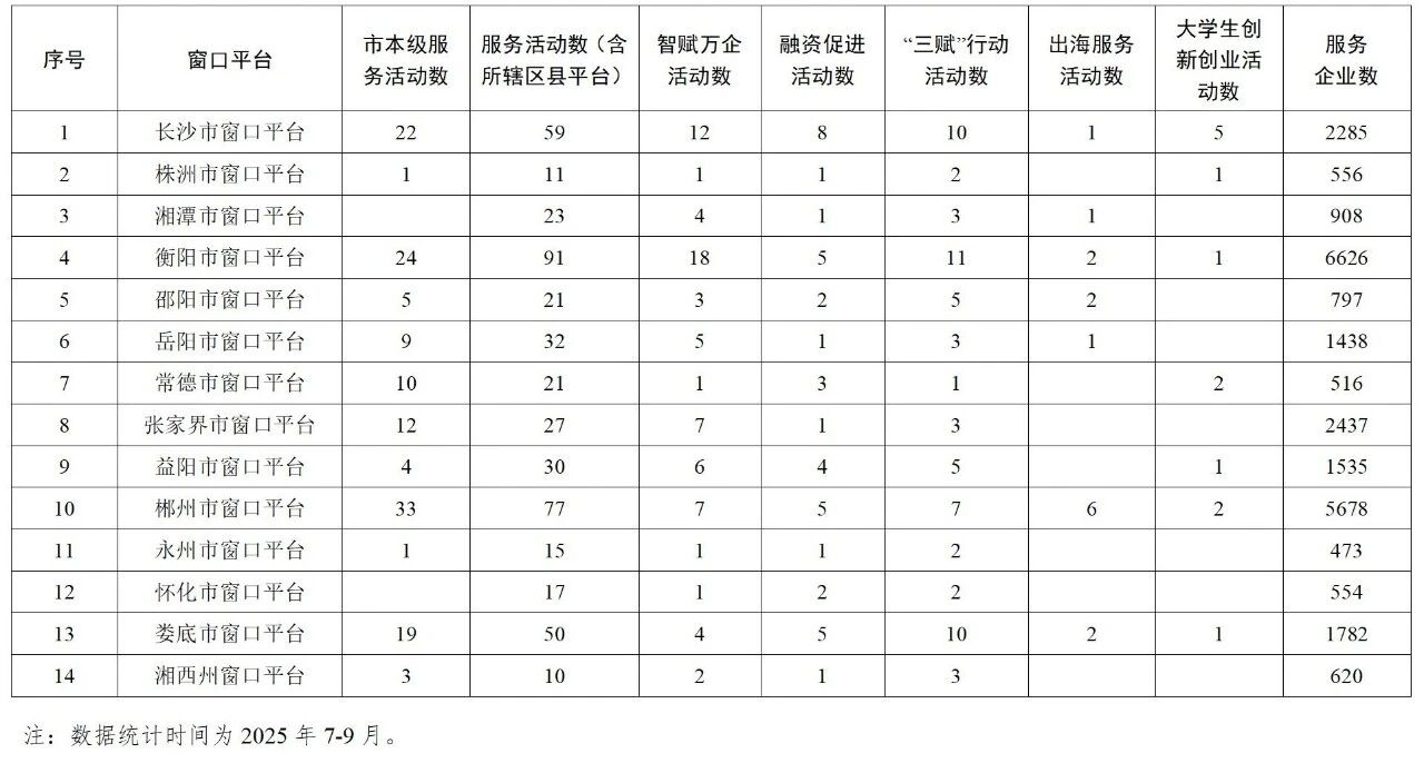 各市州工信局、县市区工信部门,各有关单位: 2025年第三季度,全省中小企业公共服务平台网络窗口平台(以下简称“窗口平台”)聚焦破解制约中小企业发展的痛点、堵点、难点,在优化服务举措、创新服务方式、提升服务质效上持续下功夫,开展一系列惠企暖企服务活动,助力中小企业高质量发展。现将第三季度窗口平台服务情况通报如下: 一、总体情况 第三季度,全省各窗口平台开展服务活动487场,服务中小企业2.65万家次(见附件)。综合运行指标,相对活跃的市州平台有长沙、衡阳、郴州、娄底,相对活跃的县市区平台有浏阳市、湘乡市、赫山区、娄星区。前三季度,全省各窗口平台累计开展服务活动1574场,服务中小企业9.29万家次、同比增长17.0%。 第三季度,全省窗口平台服务仍然存在一些不足:一是服务活动数量环比减少,较一季度和二季度分别减少20场和93场,个别市州和县市区窗口平台未开展服务活动。二是服务质量有待提升,部分活动未聚焦工作重点,形式单一且效果不够明显,企业参与度有所下降。 二、主要特点 1、实数融合深入推进。全省窗口平台共开展“智赋万企”活动72场,服务企业5283家次。株洲市窗口平台协办青岛市中小企业数字化转型城市试点产业对接活动,40余名青岛企业家赴三一重工等5家企业交流对接。衡阳市窗口平台连续推出3期中小企业数字化转型线上公开课,超5000人在线学习企业数字化转型知识。湘西州窗口平台开展覆盖式“智赋万企”数字化转型评估诊断服务,组织专家团队完成全州205家企业线上评估诊断、41家线下评估。雁峰区窗口平台举办“数字领航 智创未来”中小企业数字化转型推进活动,为企业提供智能数据分析平台和自动化流程机器人(RPA)等数字化解决方案。临澧县窗口平台组织专业技术人员免费为40家企业开展制造业数字化转型通用评估。冷水江市窗口平台举办光电子产业数字化转型与创新发展专题交流活动,帮助光电子企业设计数字化转型发展规划。 2、融资促进精准务实。全省窗口平台开展融资促进活动40场,服务企业1812家次。长沙市窗口平台承办“一月一链”中小企业融资促进全国行长沙站活动,46家中小企业发布股权融资需求43.75亿元,吸引了全国投资机构的关注。常德市窗口平台举办邮储银行金融服务专场对接会,“科创贷”“惠农贷”“无还本续贷”等多项信贷产品缓解企业融资难题。娄底市窗口平台联合金融机构开展企业担保贷款尽调,帮助湖南华南智创科技公司快速获得200 万元创业担保贷款。赫山区窗口平台举办2025年前沿技术交流与科技创新驱动发展暨银企对接会,现场初步达成6项合作意向,帮企业获得意向融资4200万元。双峰县窗口平台承办双峰县2025年政银企对接会,现场达成合作协议24项,意向授信总额超11亿元。吉首市窗口平台组织召开中小企业融资促进座谈会,帮助中小企业准确把握当前融资政策导向。 3、“三赋”活动各具特色。全省窗口平台共开展数字化赋能、科技成果赋智、质量标准品牌赋值中小企业活动67场,服务企业3351家次。长沙市窗口平台举办校企合作“双进双转”对接活动暨碳基新材料专场沙龙活动,助推新材料领域科技成果高效转化。岳阳市窗口平台举办“湘企大讲堂”人工智能+食品加工产业链专项活动,组织专家团队为120家食品加工企业数字化转型提出针对性建议。永州市窗口平台举办永州市绿色建材产业供需对接活动,10家优质绿色建材生产企业发布一批新产品和合作需求。资阳区窗口平台举办“一起益企”中小企业质量品牌提升专项活动,邀请优秀企业分享“质量立企、品牌强企”实践经验。永兴县窗口平台成立了高新技术培育中心,通过“引进来+走出去”精准对接先进技术,促成50余项成果在企业落地转化。苏仙区窗口平台协办“成长伴行”中小企业品牌提升暨文旅商品展销会,搭建产销对接平台助力文旅企业拓宽市场,提升品牌知名度。 4、出海服务紧跟形势。全省窗口平台共开展出海服务活动18场,服务企业2327家次。郴州市窗口平台举办企业出海政策宣讲暨政企对话交流会,组织相关职能部门解读政策。邵阳市窗口平台承办奔赴“一带一路”贸易蓝海主题讲座,帮助企业提升外贸业务水平。宁乡市窗口平台举办“一带一路”出海机遇解析专题讲座并为意向出海企业定制详细服务方案。湘乡市窗口平台举办中小企业出海服务对接座谈会,解读自贸区对非政策,介绍尼日利亚国情及贸易方面相关情况,助力中小企业开拓海外市场。岳阳县窗口平台承办“湖南企业走出去 湘品出海推荐会”专题培训,为企业开拓非洲市场提供“一站式”服务。娄星区窗口平台举办娄星区首届中非跨境电商沙龙分享会,围绕中非跨境电商行业发展、品牌建设和市场前景等深度交流。 5、创业服务持续加强。全省窗口平台共开展大学生创新创业服务活动14场,服务大学生初创企业548家次。省枢纽平台承办“一起益企”之“送解优”大学生初创企业服务大会,汇聚资源服务100余家大学生初创企业。株洲市窗口平台承办“‘就’在株洲·职引未来”活动,为省内外400余名高校学子提供从职业规划到就业落地的全链条服务。天心区窗口平台协办2025年“创客中国”湖南省中小企业创新创业大赛大学生参赛项目服务对接会,帮大学生参赛项目“找资金、找服务、找市场