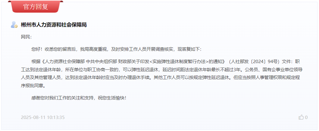 对此,郴州市人力资源和社会保障局作出回应,表示严格执行国家政策,并详细说明弹性退休的适用条件:一是职工需达到法定退休年龄,二是所在单位与职工协商一致,三是须按人事管理权限报批。该局强调,公务员及国有企事业单位领导人员不适用弹性延迟退休政策,但其他工作人员可按规定申请。