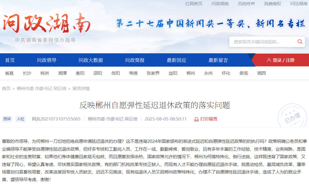 近日,“网友2021073107555065”在红网《问政湖南》平台上发帖,反映郴州市专业技术岗位人员申请延迟退休遇到困难。该网友表示,作为基层动检员,在机构改革过程中,因专技人员不足,而符合条件的临退休人员又无法办理延迟退休手续,影响了工作推进。